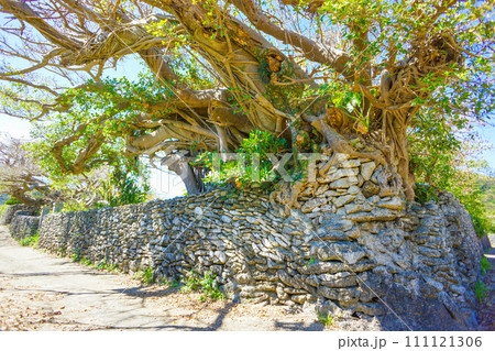 与路島のサンゴの石垣とそこに食い込むガジュマルの木