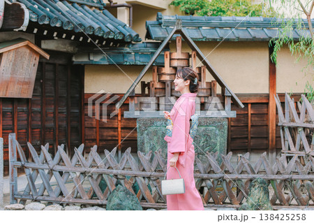 京都の観光地を巡る着物姿の若い女性