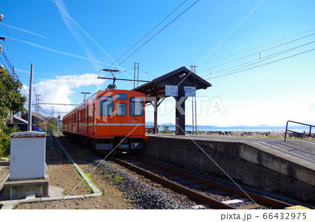 宍道湖沿いを走る一畑電車と駅のレトロなホームが青空に映える長閑な風景 … 島根県 松江市 (快晴)