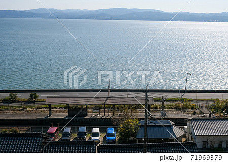 一畑電車の線路沿いの駐車場から見える秋鹿町駅のホームと宍道湖と青空の風景 … 島根県 松江市(晴れ)