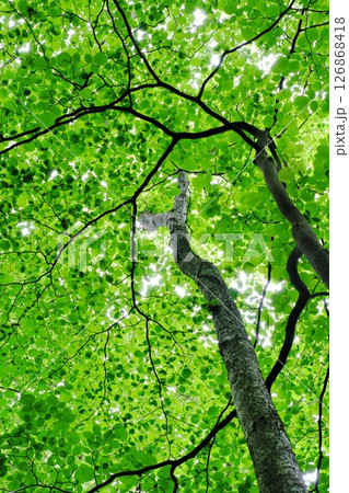 新緑の木々を見上げる(飯石郡飯南町)