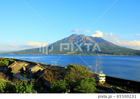 鹿児島 秋の仙巌園から見る桜島 日豊本線の鉄道 列車