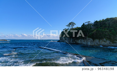 青い海と緑の森が美しい、式根島のぐんじ山展望台、丸根ヶ浜の空中ドローン撮影。 東京都伊豆諸島新島村