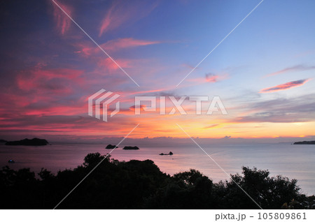 湯浅湾の夕日(右から毛無島・苅藻島・鷹島) 【和歌山県湯浅町】