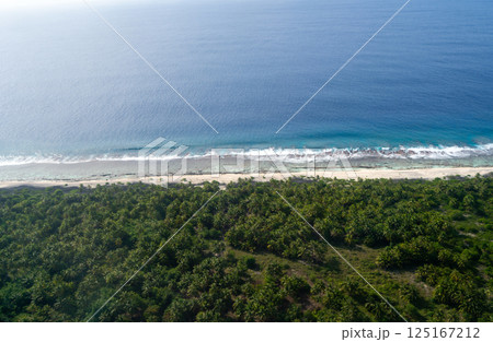 Aerial view of turquoise ocean and tropical island with Water Bungalows, Atoll, Maldives.