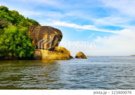 Sea, rock formation and boulder on Secret Island, Beruwala, Sri Lanka.
