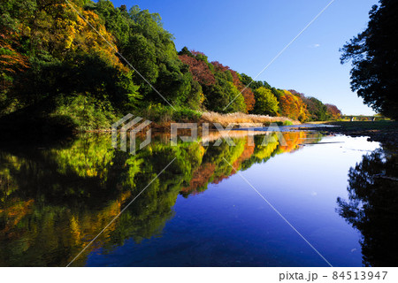 埼玉県嵐山町 紅葉の武蔵嵐山渓谷の水面に映る林