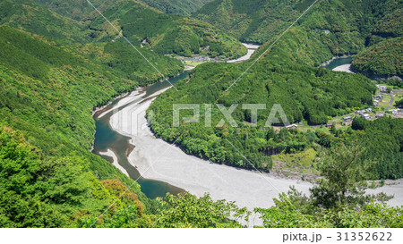 紀伊半島の三重県新宮市から観える馬蹄形(ホースシューベント)の熊野川町木津呂集落の景色