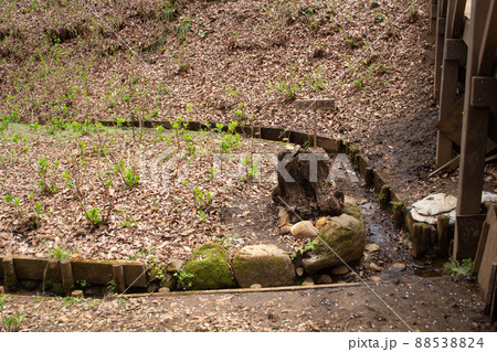 東京都武蔵村山市 空堀川の源流、立札あり、都立野山北・六道山公園域内(2022年4月撮影)