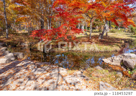 岐阜県郡上市 秋のひるがの高原分水嶺公園で紅葉の写真を撮る女性