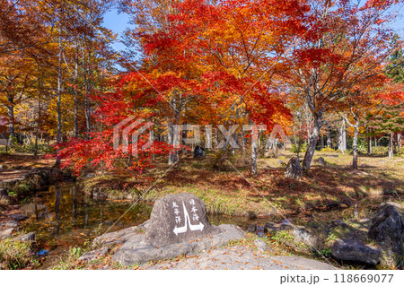 岐阜県郡上市 秋のひるがの高原分水嶺公園の水の分かれる地点の石標