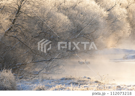 朝日色に染まる川面と樹氷を背景に飛び立つタンチョウのつがい
