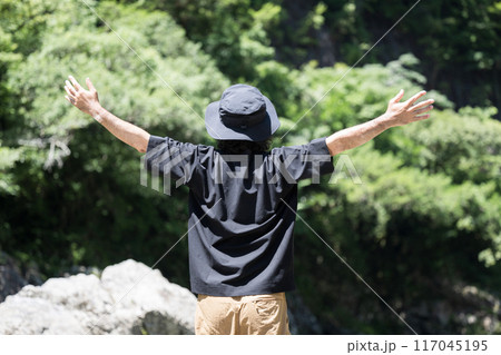 夏のレジャーやアウトドアを楽しむ男性の後ろ姿 顔無し 自由なイメージ