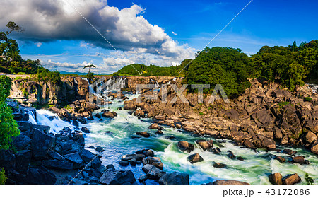 緑に囲まれた東洋のナイアガラ 曽木の滝の水の流れ