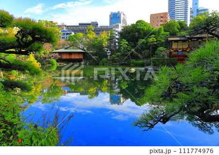 初夏の相楽園の風景 池越しに見る船屋形 兵庫県神戸市中央区