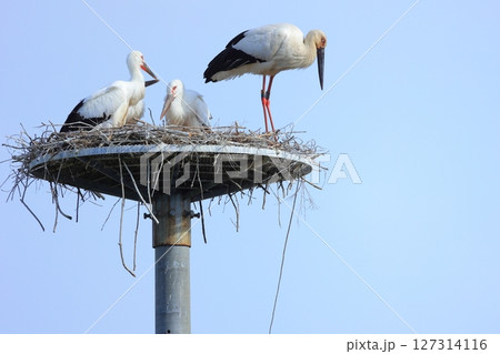 人口巣塔に巣を作りひなを育てるコウノトリ