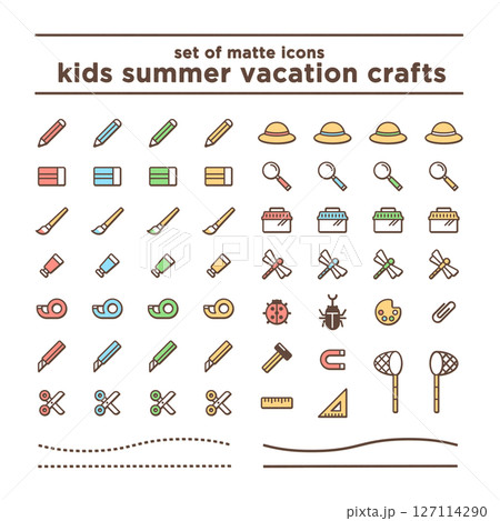 マット調のアイコンのセット、子供の夏休みの工作