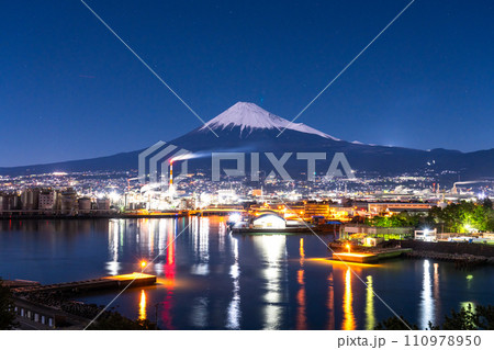 静岡県富士市田子の浦から見る富士山と工場夜景