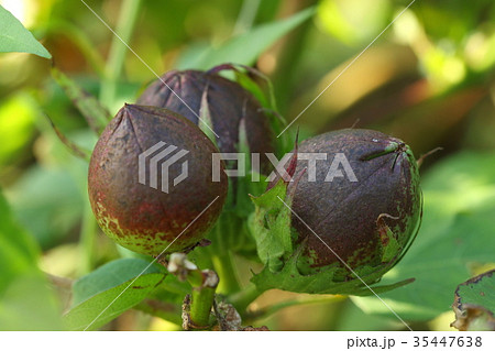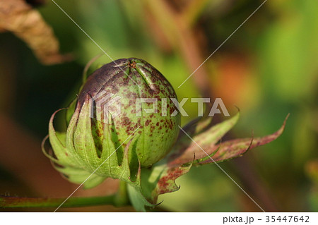 自然 植物 ワタ、九月下旬。もう少しではじけて白い綿毛が顔を出しそうなワタの実①