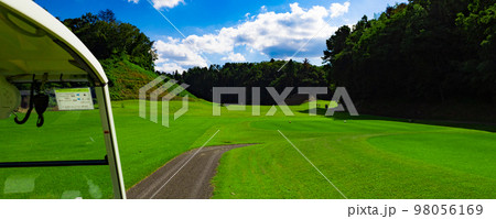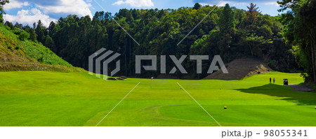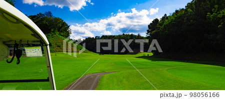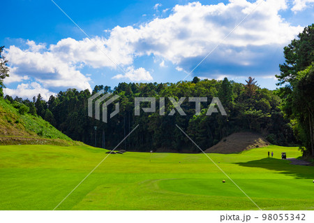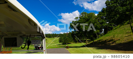 青空のゴルフ場・緩やかなカーブと上り坂のロングコースとティーイングエリアのパノラマ(千葉県木更津市)