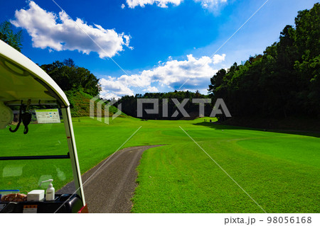 青空のゴルフ場・緩やかなカーブと上り坂のロングコースとティーイングエリア(千葉県木更津市)