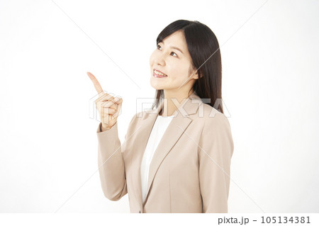 上を指差すミドルエイジのビジネスウーマン 白背景