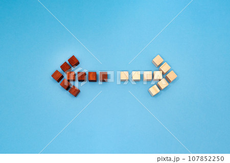 赤と黄色のウッドキューブの矢印が逆方向を指す青い背景の正面