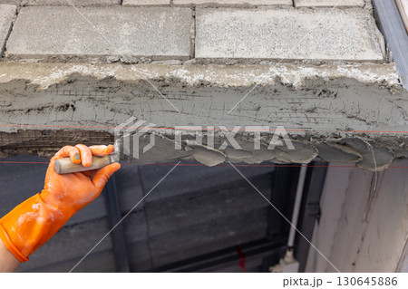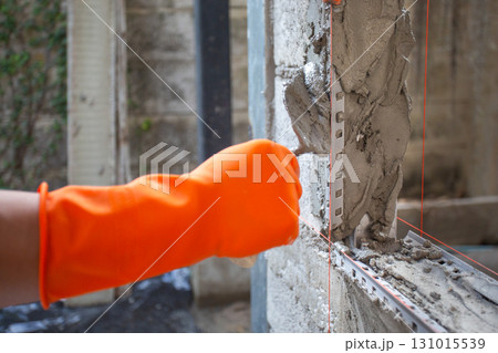 Builder tiler applies adhesive cement mortar to wall using comb trowel.
