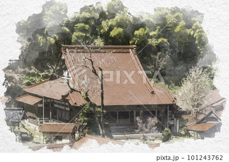 水彩画風 石見銀山大森町並み 西性寺 本堂 島根県大田市