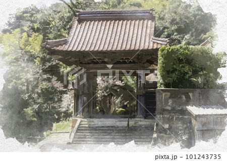 水彩画風 石見銀山大森町並み 西性寺 山門 島根県大田市