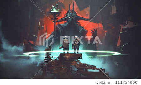 Warrior Facing Giant Demon in Epic Fantasy Battle