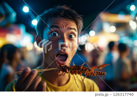 Tourist man holding skewered giant insect at night market. Street food in Asia