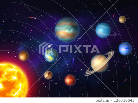 Solar system of planets, vector illustration with large and small celestial bodies flying in space
