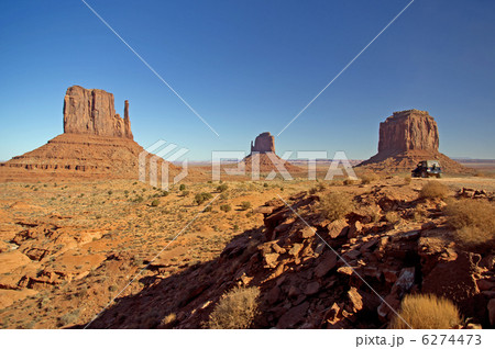 アメリカ・ユタ州アリゾナ州のモニュメントバレーにて3つのビュート昼間の様子ハイライト