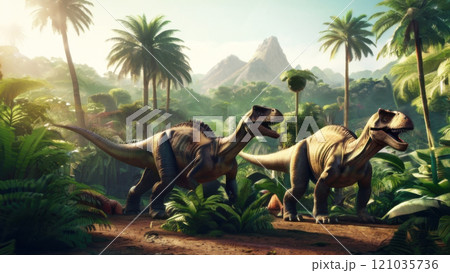 スピノサウルスと毛の生えたティラノサウルスが植物が生い茂る水辺で対峙しにらみ合い縄張り争いをする