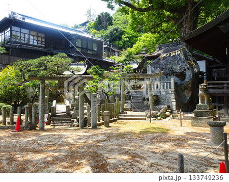 広島県尾道市 艮神社の拝殿に隣接して岩塊に注連縄が巻かれている様子