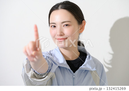 スポーツウェアで指差すカメラ目線の女性