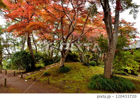 新潟県長岡市 もみじ園の散策路の門と紅葉