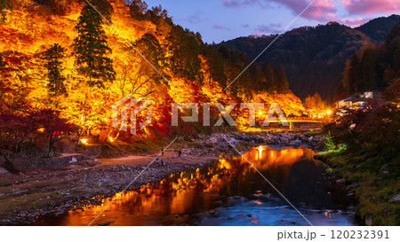 巴川沿いの美しい紅葉風景ライトアップ