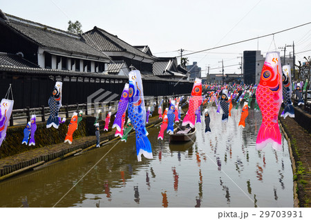 栃木県栃木市 巴波川周辺の「蔵の街」の風景と沢山の鯉のぼり