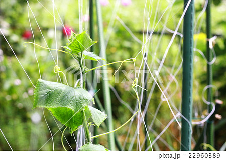 巻きひげでネットに絡むキュウリ