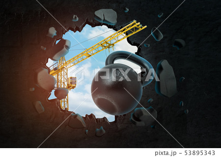 3d rendering of hoisting crane carrying black kettlebell and breaking black wall leaving hole in it
