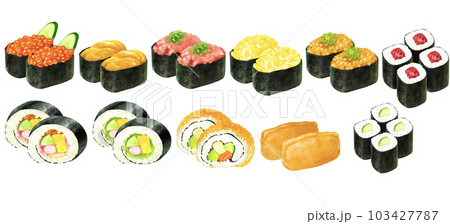 おいしそうな握り寿司や手巻き寿司などのベクターイラスト素材/寿司/持ち帰り/手作り/海苔巻き