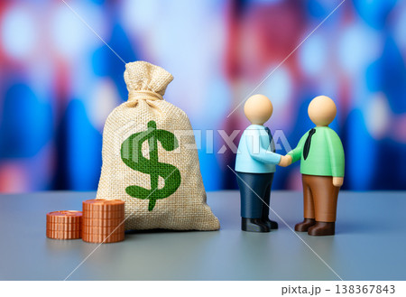 Businessman shaking hands and dollar money bag. Financial agreement shapes cooperation. Negotiation strategy influences deal outcomes and business growth.