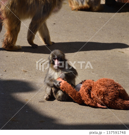 オランウータンぬいぐるみとパンチ、市川動植物園のニホンザル