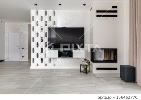 TV above wooden cabinet in modern empty room with plants carpet on wooden background. Japanese style theme. Architecture and interior concept. 3D illustration rendering