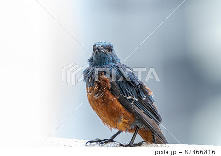 イソヒヨドリ オス マンション手摺 東京で急増中 胸,背,腰が青藍色 腹は赤褐色 翼と尾は黒っぽい