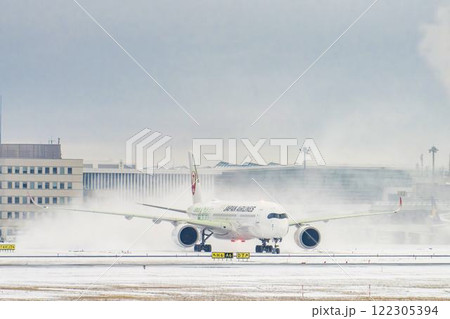 冬の新千歳空港 雪煙とタキシング中の飛行機 北海道千歳市
