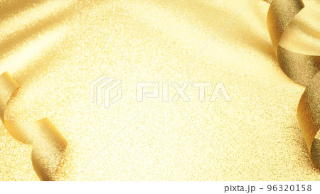 豪華な金色の布とくるくると巻かれた金色のリボン。背景素材。(ラメ生地)