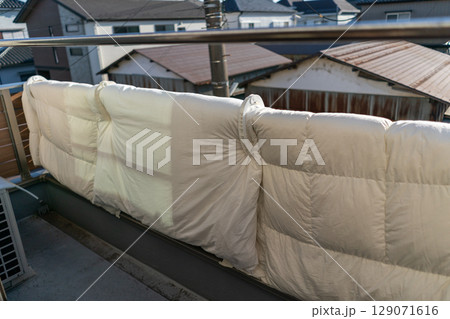 晴れた日に布団を干す。家事・日常イメージ。虹。